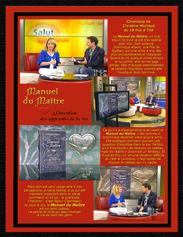 « Dominique Allaire nous offre dans Le Manuel du Maître une synthèse remarquable des grands principes et des grandes lois universelles pour devenir à la fois maître et apprenti de la vie. Dans un langage simple, l’auteure nous fait découvrir des enseignements intemporels puissants qui nous indiquent la voie du maître intérieur. Il s’agit là d’un merveilleux livre auquel nous avons accès en tout temps pour y puiser les sages conseils du maître en devenir que nous sommes. »